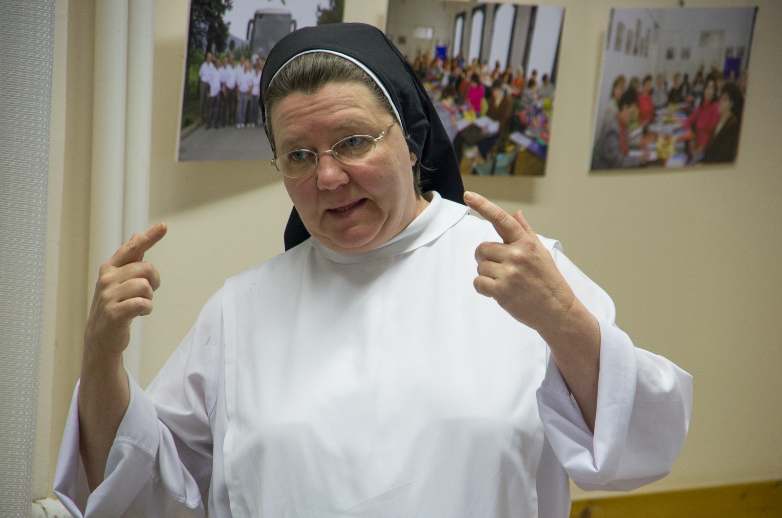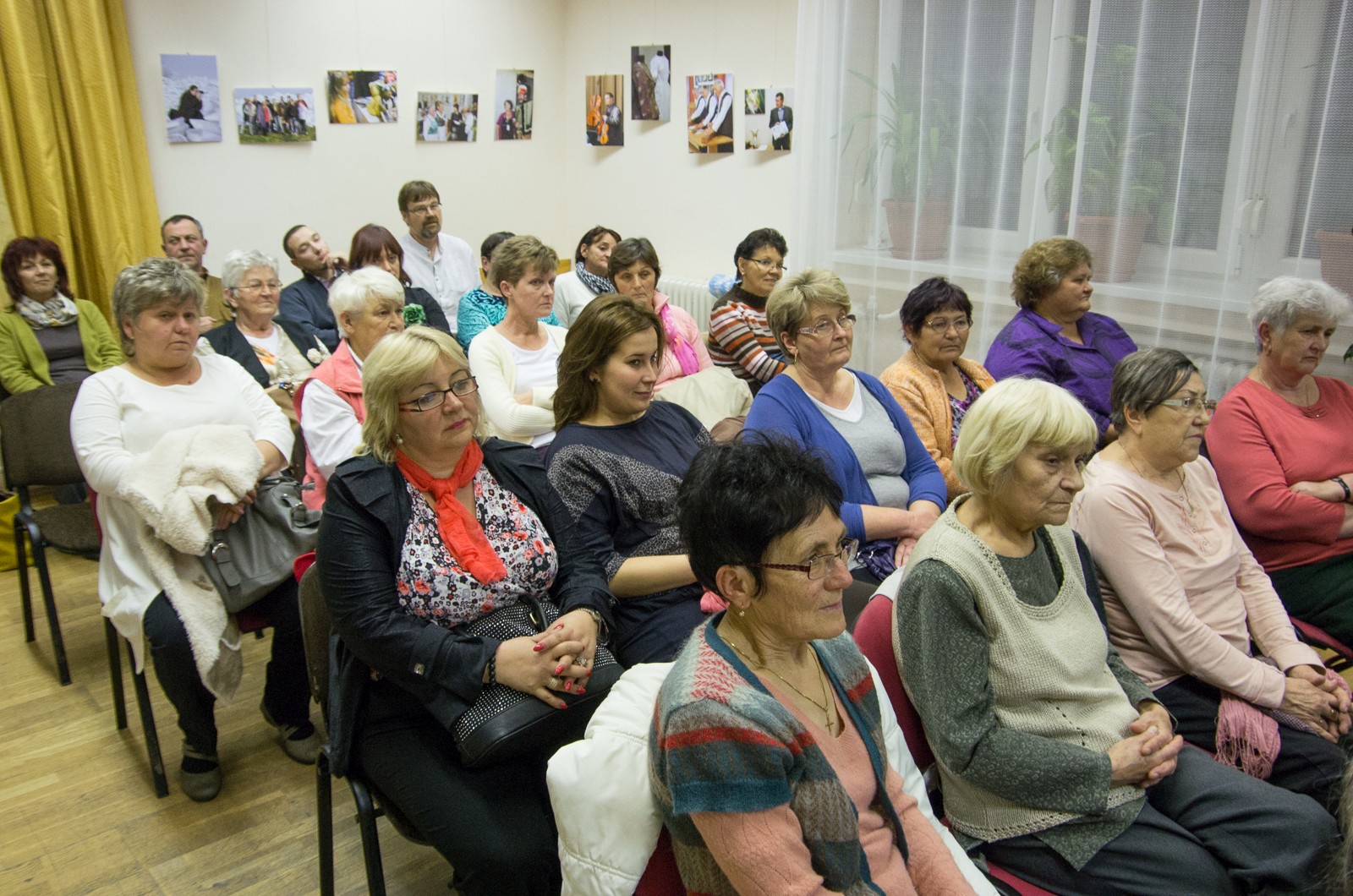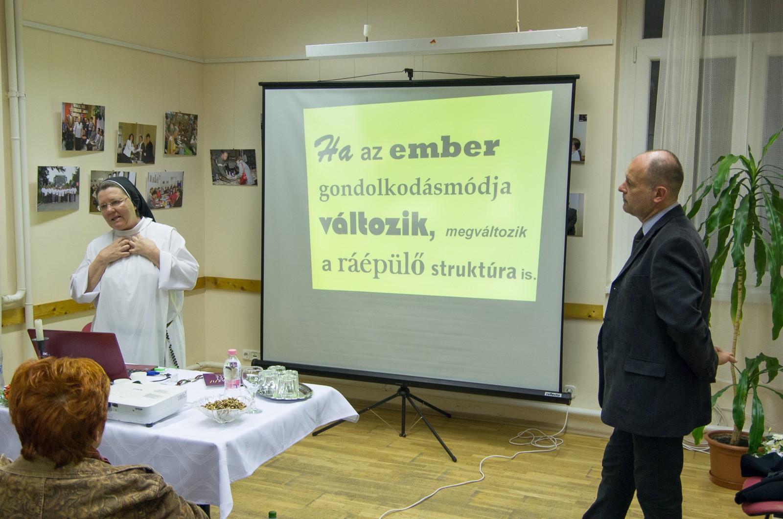 Már a bejáratnál kíváncsi szemek követték a fehér „habitusban” érkező Laura nővért, aki kedves, közvetlen modorával megnyerte az érdeklődőket. Előadására elkísérte Fóris Ferenc nagyvállalati vezető is, aki Laura nővér szavait saját tapasztalataival egészítette ki. Mindketten a Keresztény Társadalmi Elvek a Gazdaságban elnevezésű csoport tagjai.