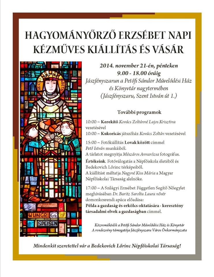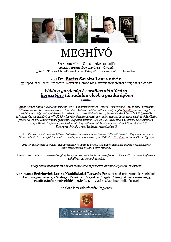 Nagy sikerű előadással zárult a hagyományos Erzsébet napi rendezvénysorozat a Petőfi Sándor Művelődési Ház és Könyvtárban. A Szilágyi Erzsébet Független Segítő Nőegylet meghívására vendégünk volt dr. Baritz Sarolta Laura domonkos rendi nővér, közgazdász.