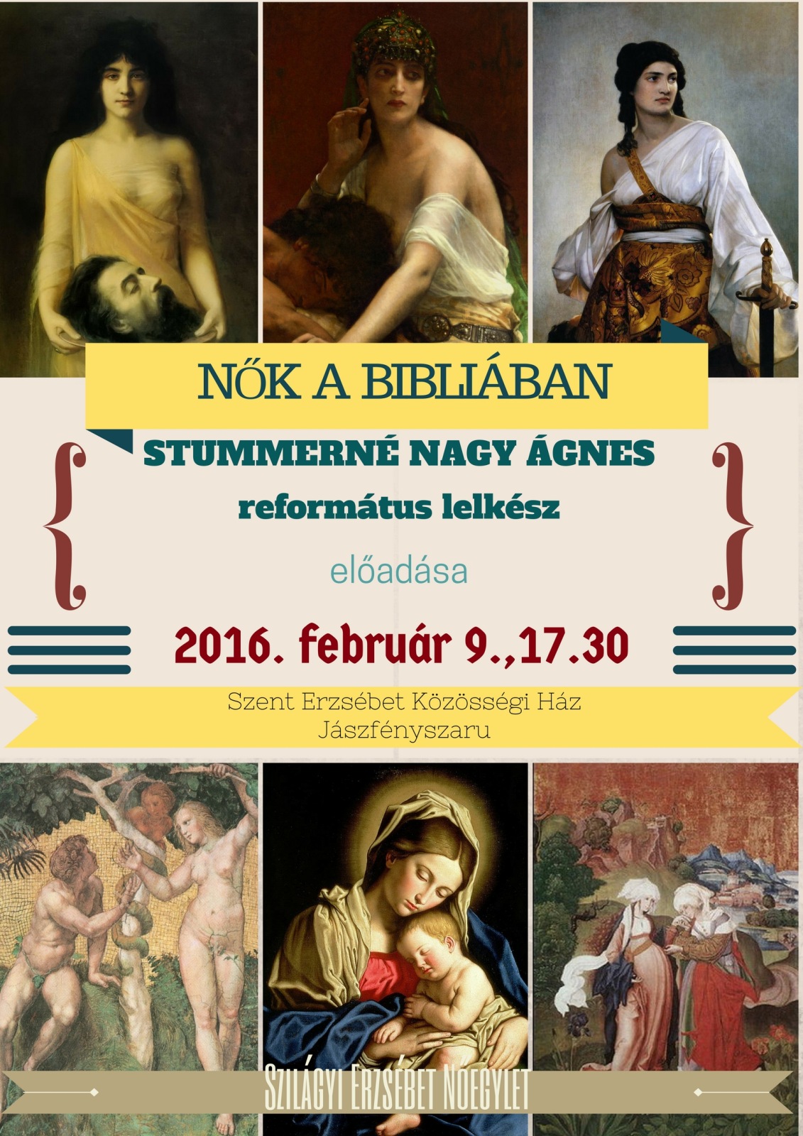 A Szilágyi Erzsébet Nőegylet 2016. február 9-én 18 órától a Szent Erzsébet Közösségi Házban látta vendégül Stummerné Nagy Ágnes református lelkészt, aki Nők a Bibliában címmel tartott előadást.