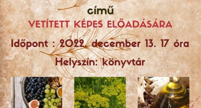 2022. december 13- án a könyvtárba vártuk szeretettel az érdeklődőket Nagyné Kiss Mária ismeretterjesztő előadására. Az előadás után kis kóstolóval és  bemutatóval vártuk az érdeklődőket.
